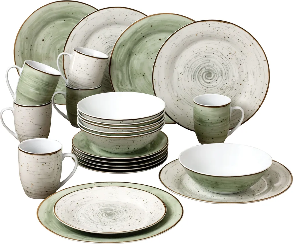 Das 24-teilige Set beinhaltet vier Geschirrteile, in jeweils zwei Farben und dreifacher Ausführung. Beide Farbvarianten haben ockerfarbene (beinah goldene) Ränder, die Speisen und Getränke stilvoll rahmen. Die hellere Variante im sanften Elfenbeinton ist künstlerisch schraffiert und bildet einen hervorragenden Kontrast zum Strudeldekor im sanften Moosgrün. Zudem ist die Kollektion abstrakt gepunktet. Unter- und Innenseiten sind schlicht, in Weiß (Lichtgrau) gehalten.