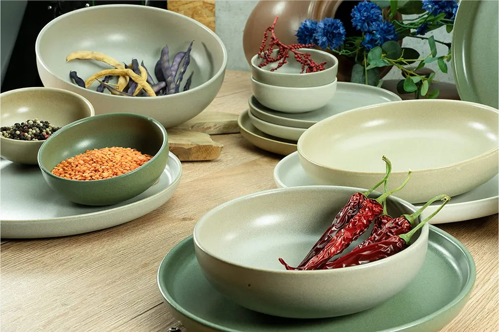 Das Geschirr präsentiert sich in einer weichen, harmonisch ausbalancierten Form in den Trendfarben Grün, Terra, Stein und Sand mit einer seidenmatten Spezialglasur.