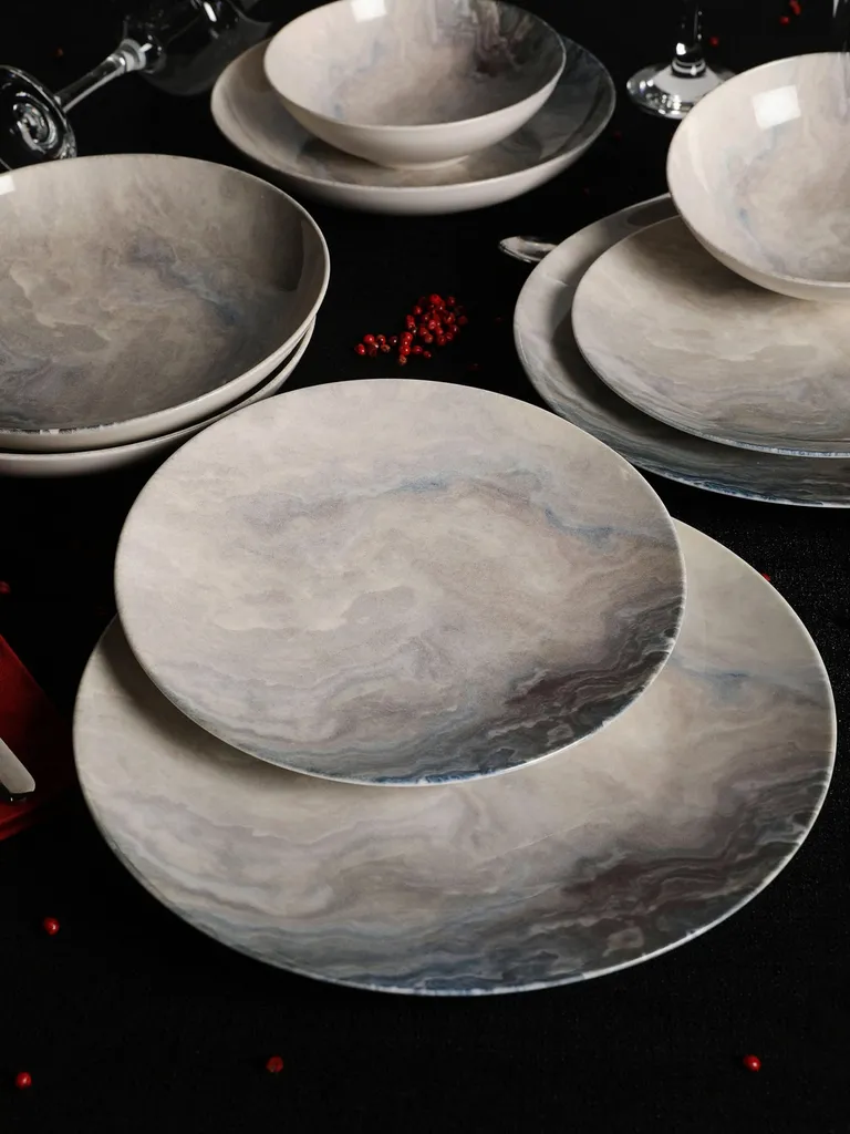 Mit diesem edlen 24-teiligen Tafelservice kannst du dein Abendessen auf stilvolle Weise servieren. Es besteht aus Speisetellern, Servierplatten und Schüsseln. Dieses Porzellanset bringt Leben in die Party und sorgt für Gesprächsstoff unter den Gästen. Das stilvolle blaue Design ist dank des kratzbeständigen und bruchsicheren Materials sehr langlebig.