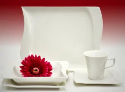 Dieses 30-teilige Kombiservice in eckiger Form mit geschwungener Kante besteht aus weißem Porzellan. Alle Teile sind spülmaschinen- und mikrowellengeeignet. Das Set beinhaltet Tassen und Untertassen sowie Dessert- und Essteller.