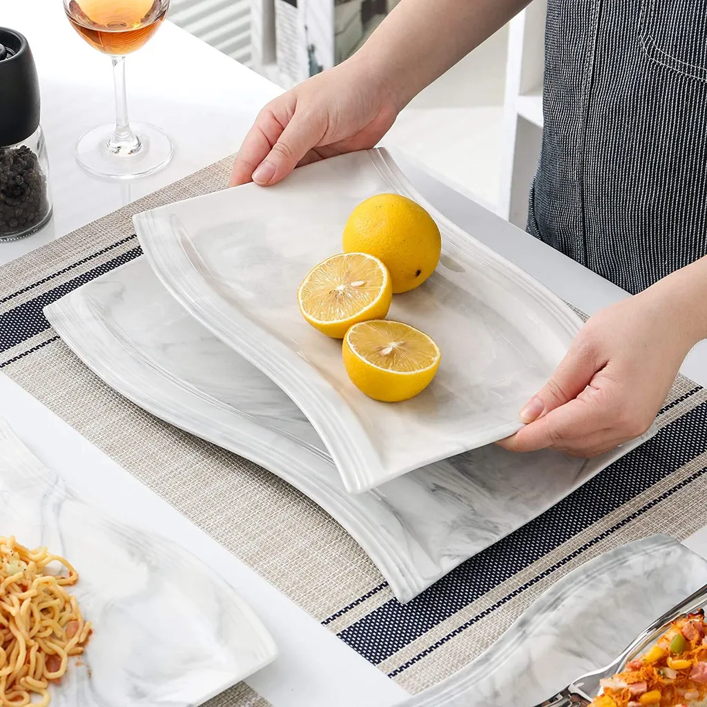 - SCHÖNES GESCHIRRSET AUS PORZELLAN IN MARMOR – Wir halten an der alten Porzellantechnologie fest und bestehen darauf, jeden Prozess von Hand zu machen. Hochwertige Porzellanselektion, Einzigartige und künstlerische Verglasungstechnik und darüber hinaus mit einem präzise gesteuerten Temperaturbrand macht jeder Teller besonders unterschiedlich.