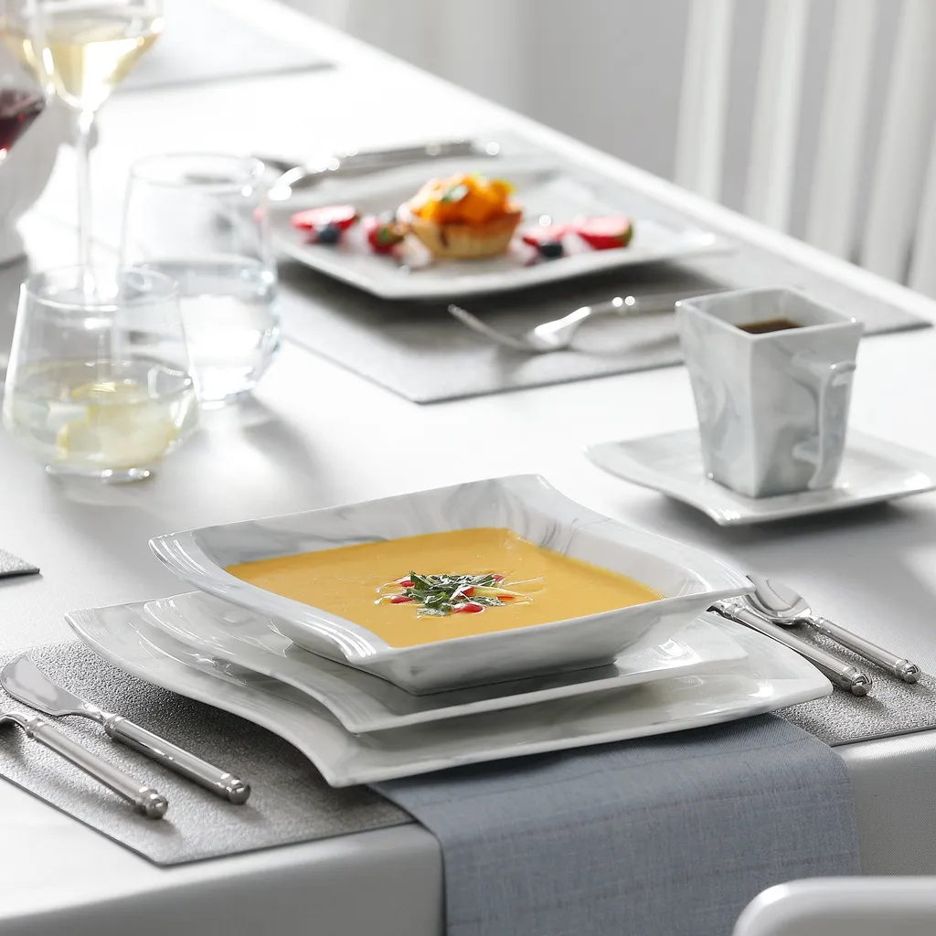 - SCHÖNES GESCHIRRSET AUS HOCHWERTIGEM PORZELLAN IN MARMOR | Hochwertige Porzellanselektion, einzigartige und künstlerische Verglasungstechnologie sowie ein präzise kontrollierter Temperaturbrand sorgen dafür, dass jeder Teller leicht und dünn aussieht und im tatsächlichen Gebrauch langlebig ist. Beinhaltet 12x Flachteller [10,2″/26 x 26 x 1,6cm] & 12x Suppenteller [20 x 20 x 4,4cm] & 12x Dessertteller [8,2″/21 x 20,6 x 1,5cm] & 12x Tassen [11 (inkl. Griff) x H 8,6 cm/220 ml] & 12x Unterteller [5,5″/13,8 x 13,8 x 1,2cm]