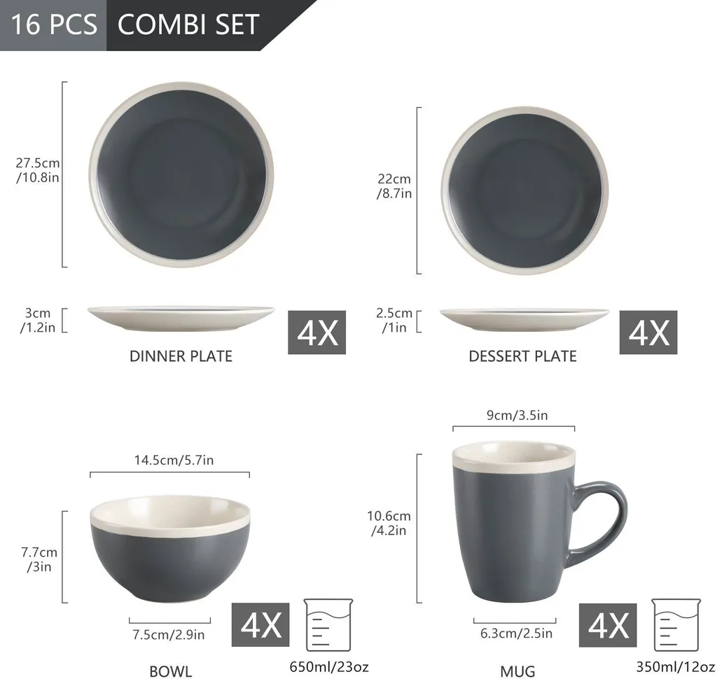- Komplette Kollektionen. 16-teiliges SEESAMI Tafelservice Set im modernen Aussehen besteht aus 4 Müslischalen Ø 14,5 cm, 650ml, 4 Dessertteller Ø 22 cm, 4 Speiseteller Ø 27,5 cm und 4 Kaffeetassen, 350ml; Dank des naturfarbenen Design kann unser Geschirrset hervorragend mit anderen Serien kombiniert werden.