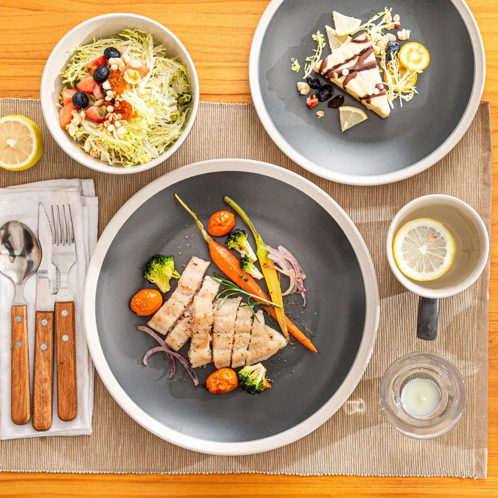 - Individuelles modernes Design. Aus hochwertigem und umweltfreundlichem Steingut ist das Geschirrset von Hand gefertigt. Einzigartige schwarze Sesam Oberfläche, ungewöhnliche weiße Kante, wunderschönes mattes Design, vielfältige Farbungen und stilvolle moderne Optik entsteht eine angenehme Harmonie, was Ihren Tisch etwas schick machen;