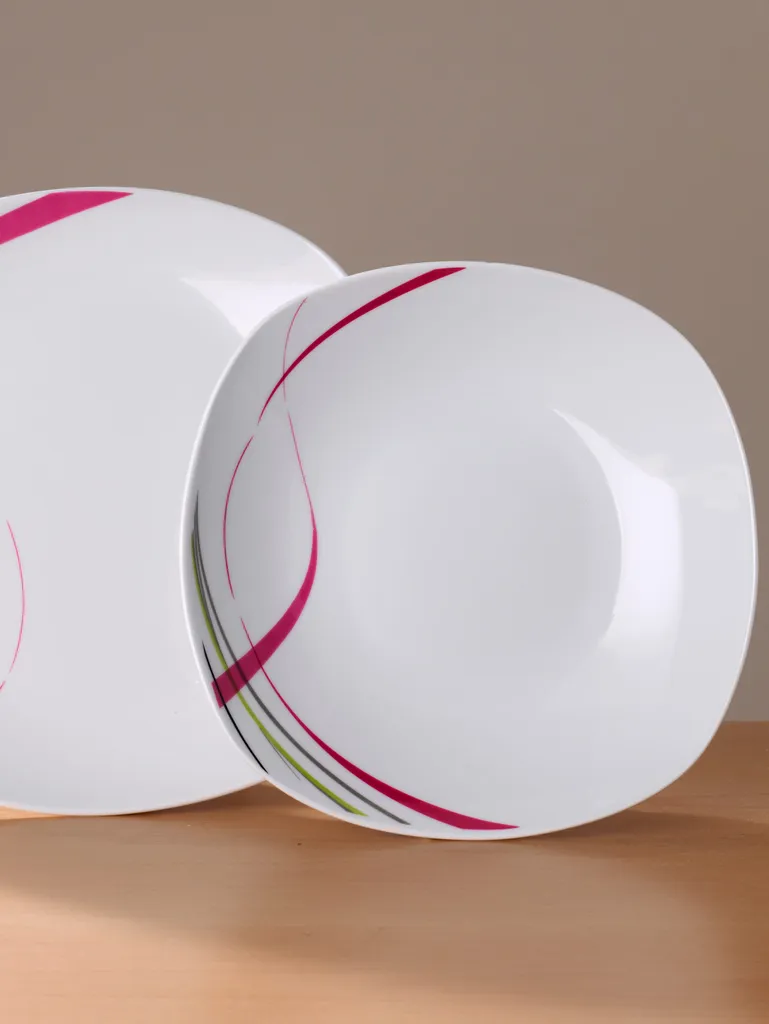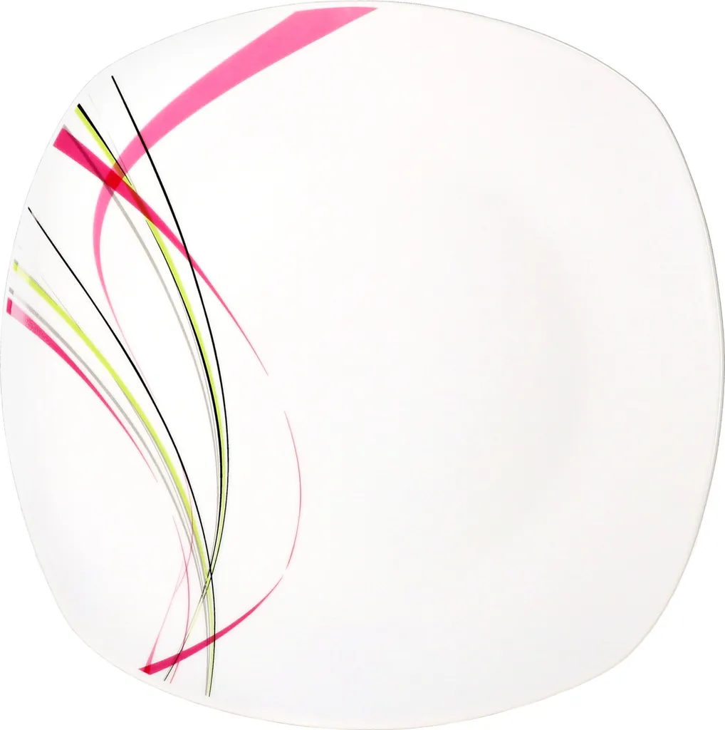 12tlg. Tafelservice Fashiom von vanWell. Moderne eckige Form mit abgerundeten Ecken. Aus hochwertigem weißen Porzellan mit einem trendigenNachbildung in grün, lila, grau und schwarz. Spülmaschinen- und mikrowellengeeignet. Für 6 Personen. Bestehend aus: 6 Teller flach Ø 25 cm und 6 Teller tief Ø 21,5 cm.
