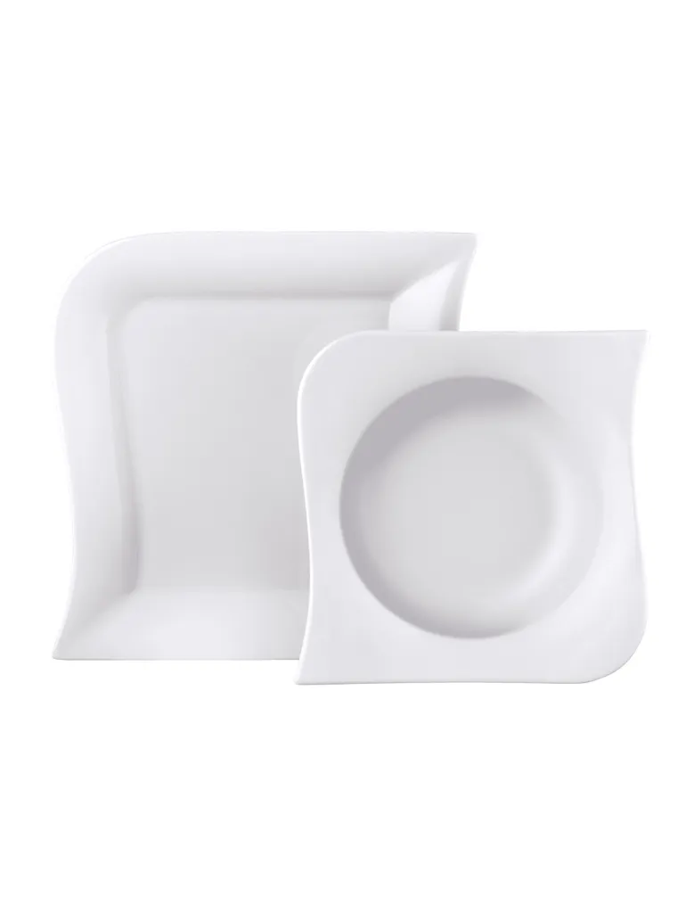 12tlg. Tafelservice ‚Opera‘ von van Well. Dieses moderne Service passt mit seiner quadratischen Formgebung und den geschwungenen Ecken zu jeder Gelegenheit. Gefertigt aus hochwertigem weißem Porzellan lässt es sich mit den unterschiedlichsten Tischdekorationen immer wieder neu inszenieren. Spülmaschinen und mikrowellengeeignet. Für 6 Personen. Bestehend aus: 6 Teller tief Ø 22 cm und 6 Teller flach Ø 27 cm.