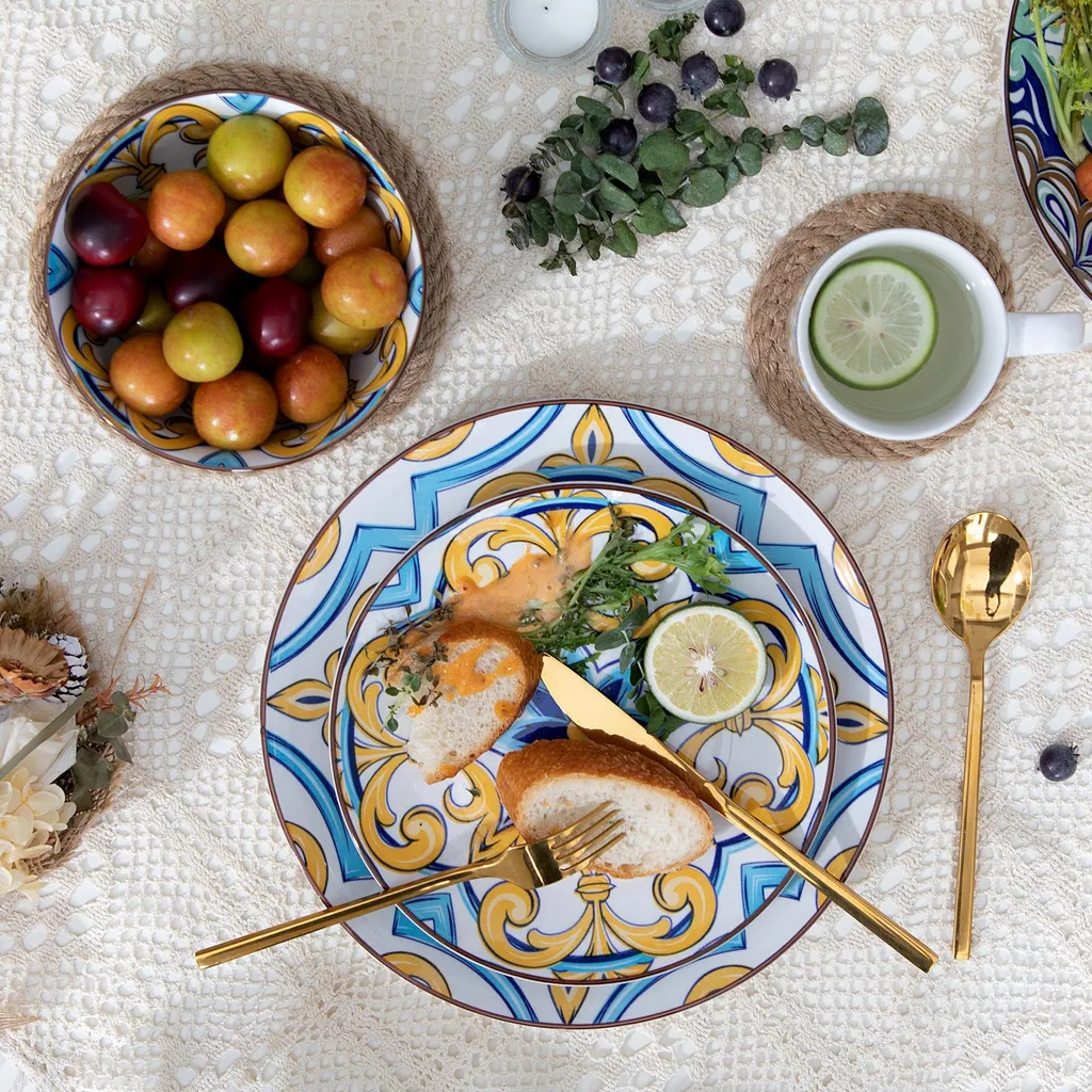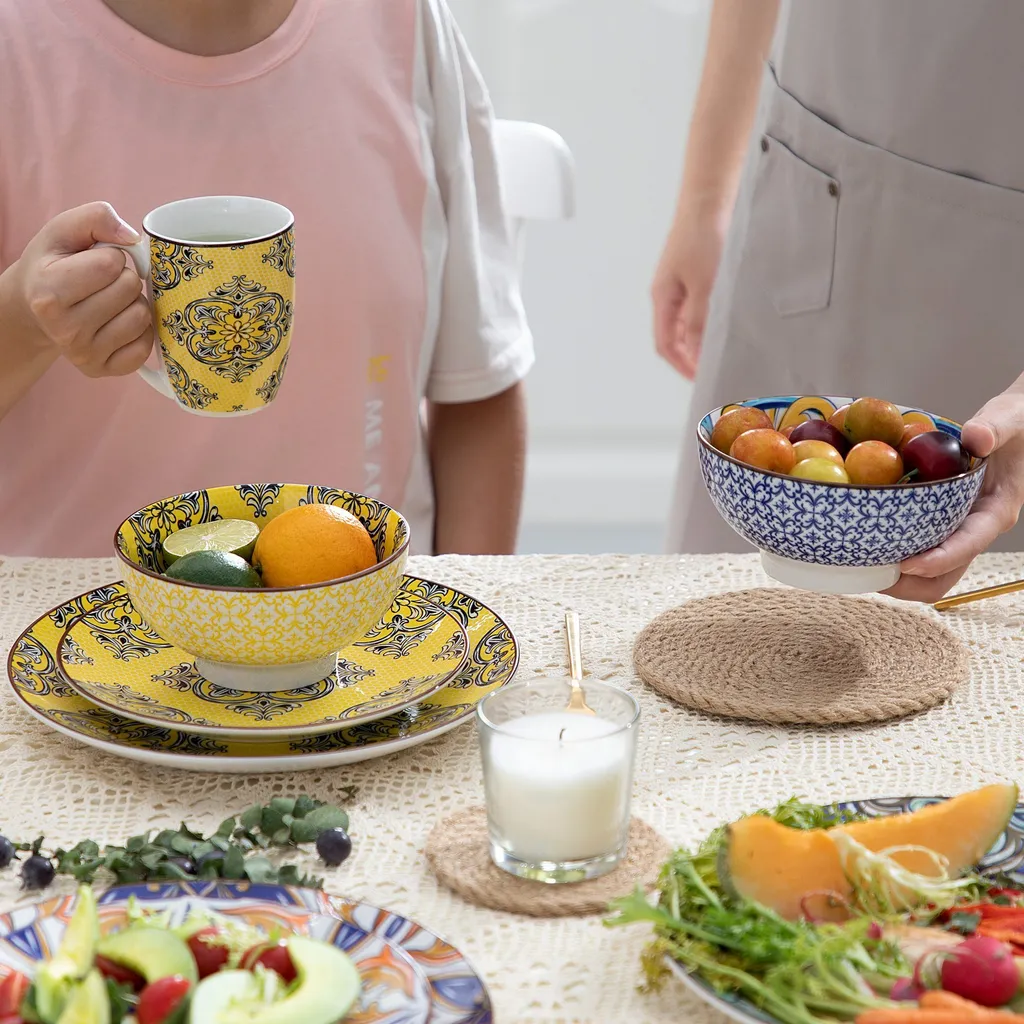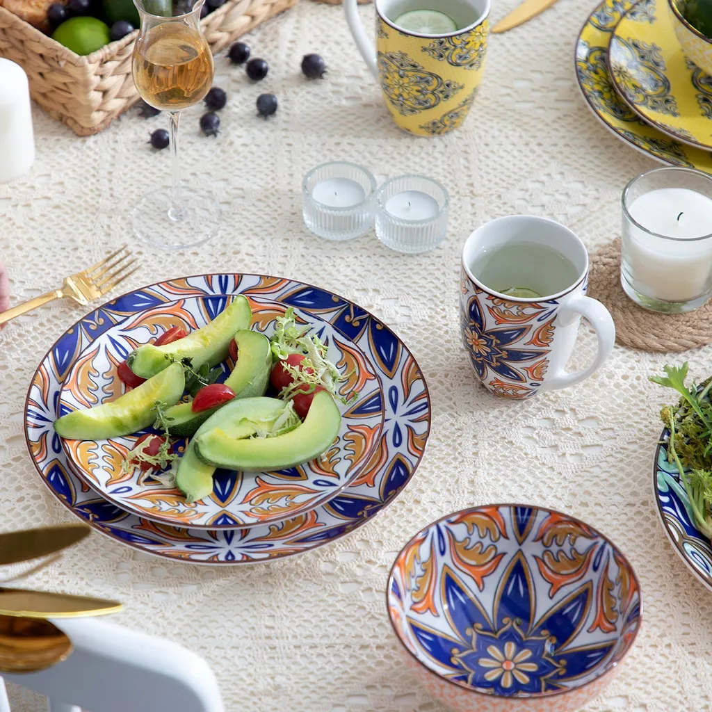 - Komplette Kollektionen. 16-teiliges Porzellan Kombiservice im böhmischen Stil besteht aus 4 Kaffeebechern 400 ml, 4 Müslischalen Ø15 cm, 4 Desserttellern Ø21 cm und 4 Speisetellern Ø27 cm. Ihre erste Wahl für das fröhliche Tischambiente, perfekt für 4 Personen.