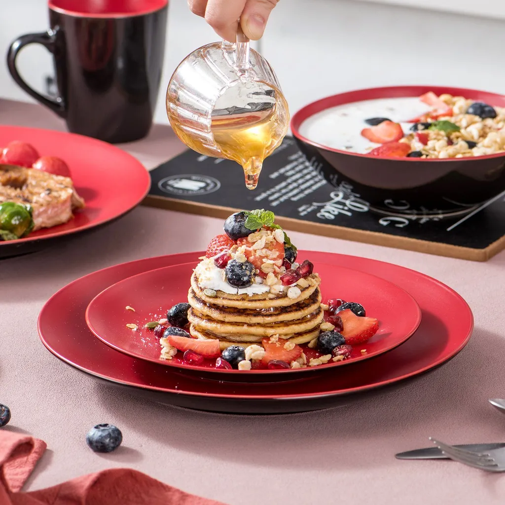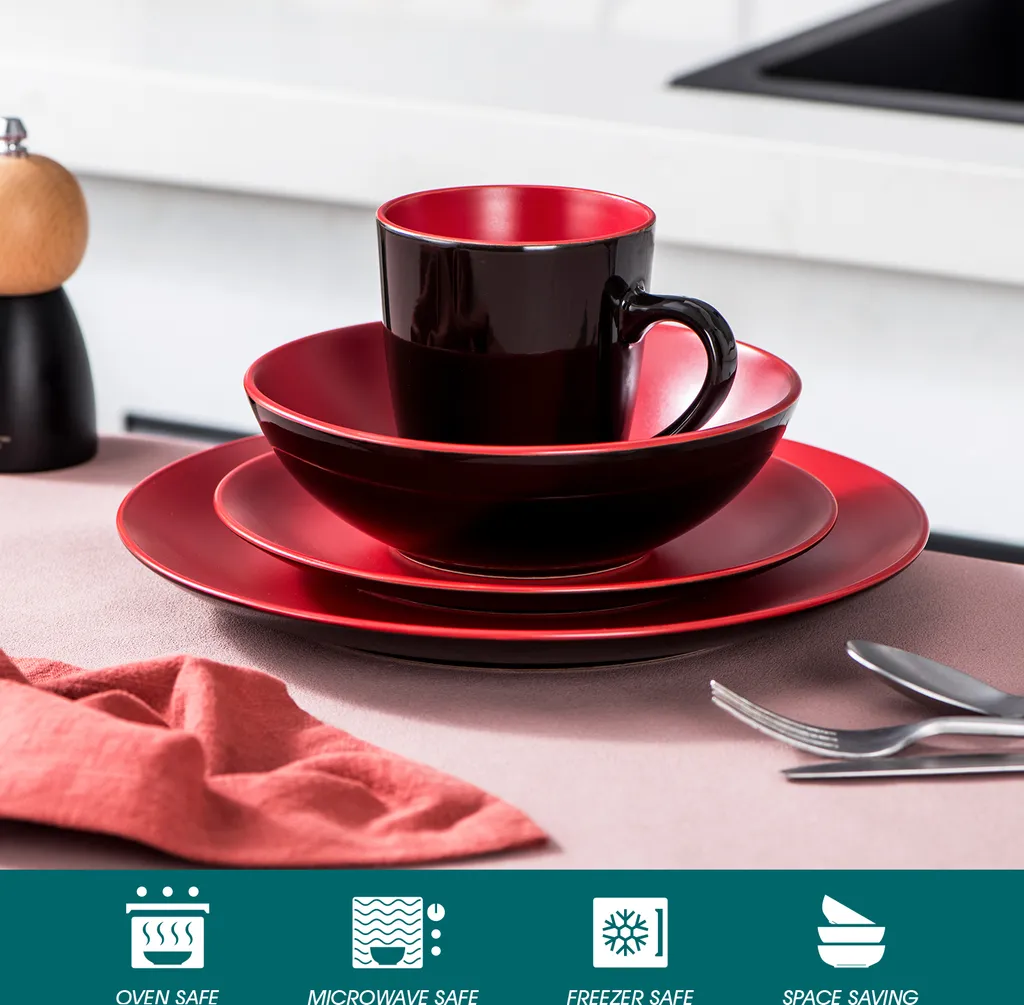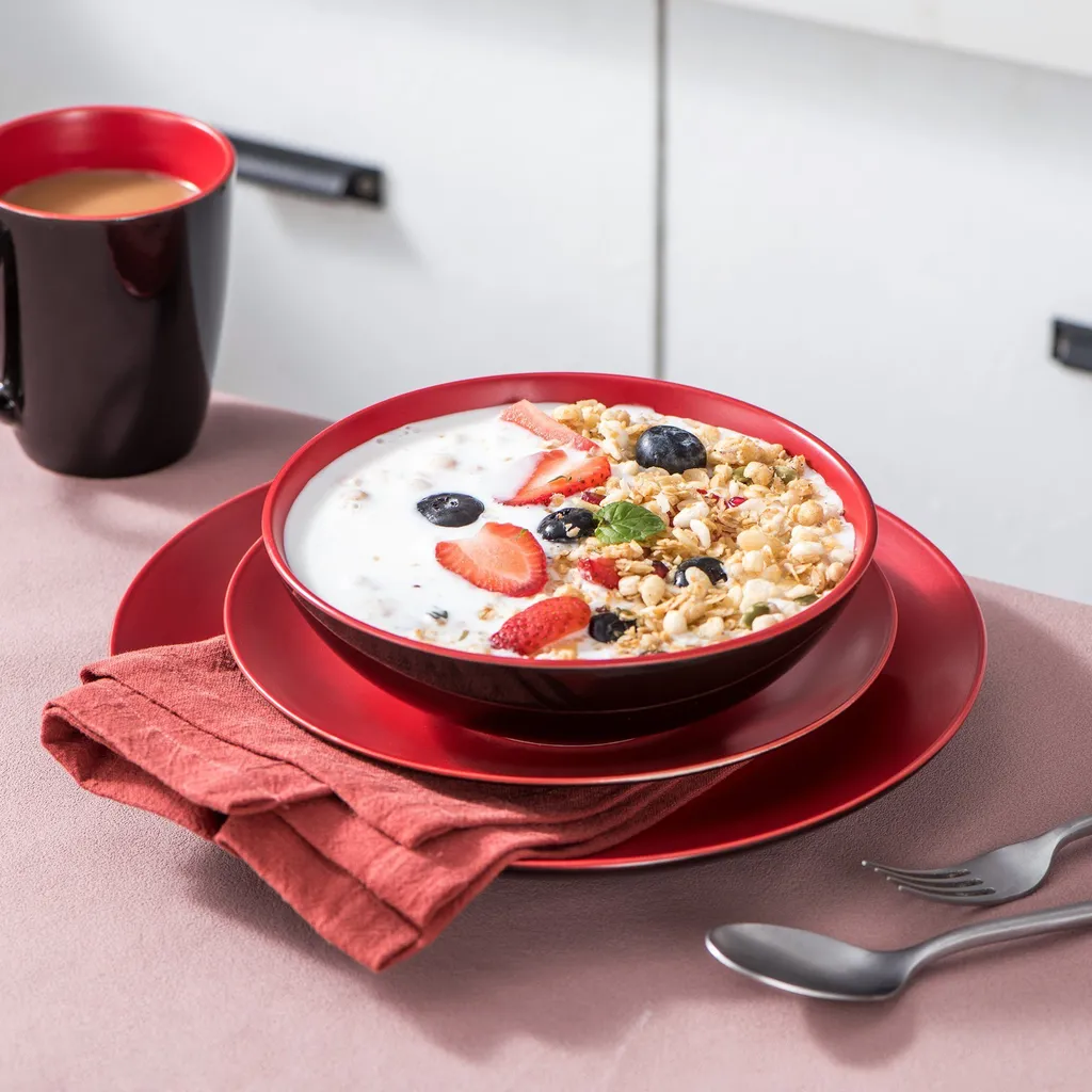 - Einfach zu reinigen. Das Geschirrset ist mikrowellengeeignet, spülmaschinenfest, kühlschrankgeeignet, kratz- und schnittfest, säure- und fleckenresistent, geruchs- und geschmacksneutral, pflegeleicht. Keine schadstoffhaltige Kunststoffbeschichtung.