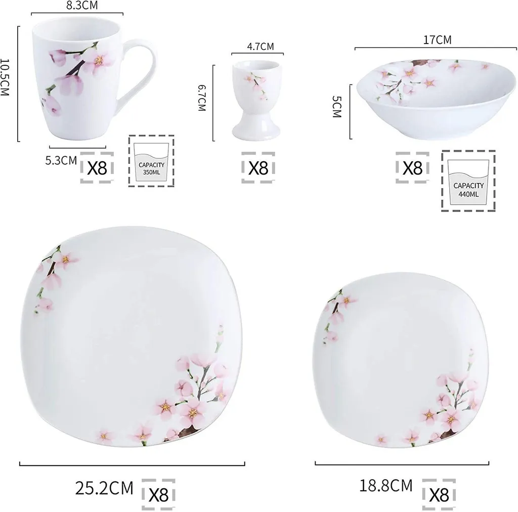 - LIEFERUMFANG – Im Lieferumfang enthalten sind: 8 Eierbecher (Ø 4,8 cm), 8 Kaffeebecher (350 ml, H 10,2 cm), 8 Müslischalen (Ø 17 cm), 8 Dessertteller (Ø 19,2 cm), 8 Speiseteller (Ø 24,7 cm)